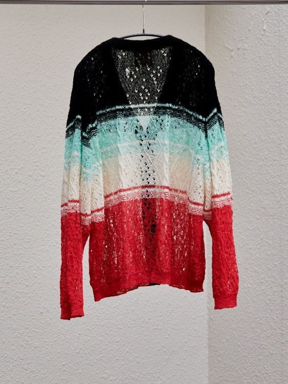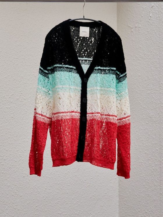 I wanted to create a lightweight cardigan, so I decided to go with lace knitting. It was a straightforward decision, but the result turned out to be amazing. I aimed for a broken lace knitting look and consulted with the factory about the lace patterns, learning a lot from them.