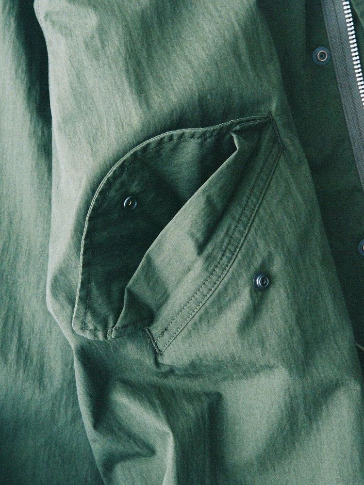 The outer fabric is a domestically produced cotton-nylon cross with a vintage look, dyed twice to replicate vintage military wear in a modern way.