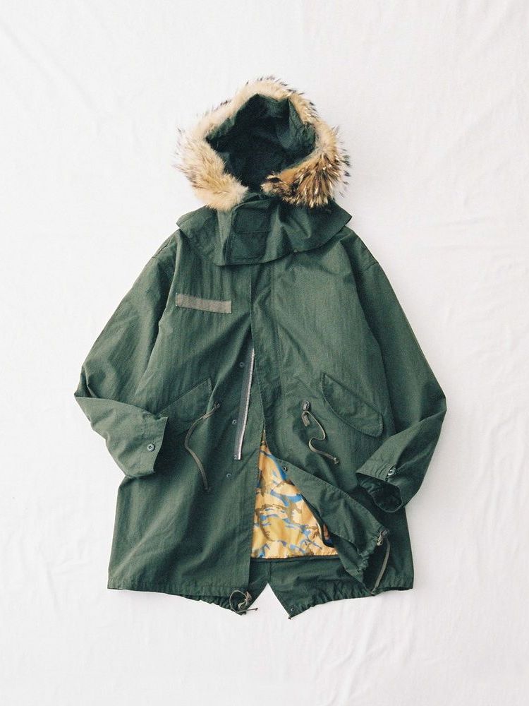 By using double-dyed vintage-like cotton-nylon cross as the outer fabric and incorporating details such as woodland camouflage on the liner, it creates a pop mood and originality, giving it a distinctive presence.