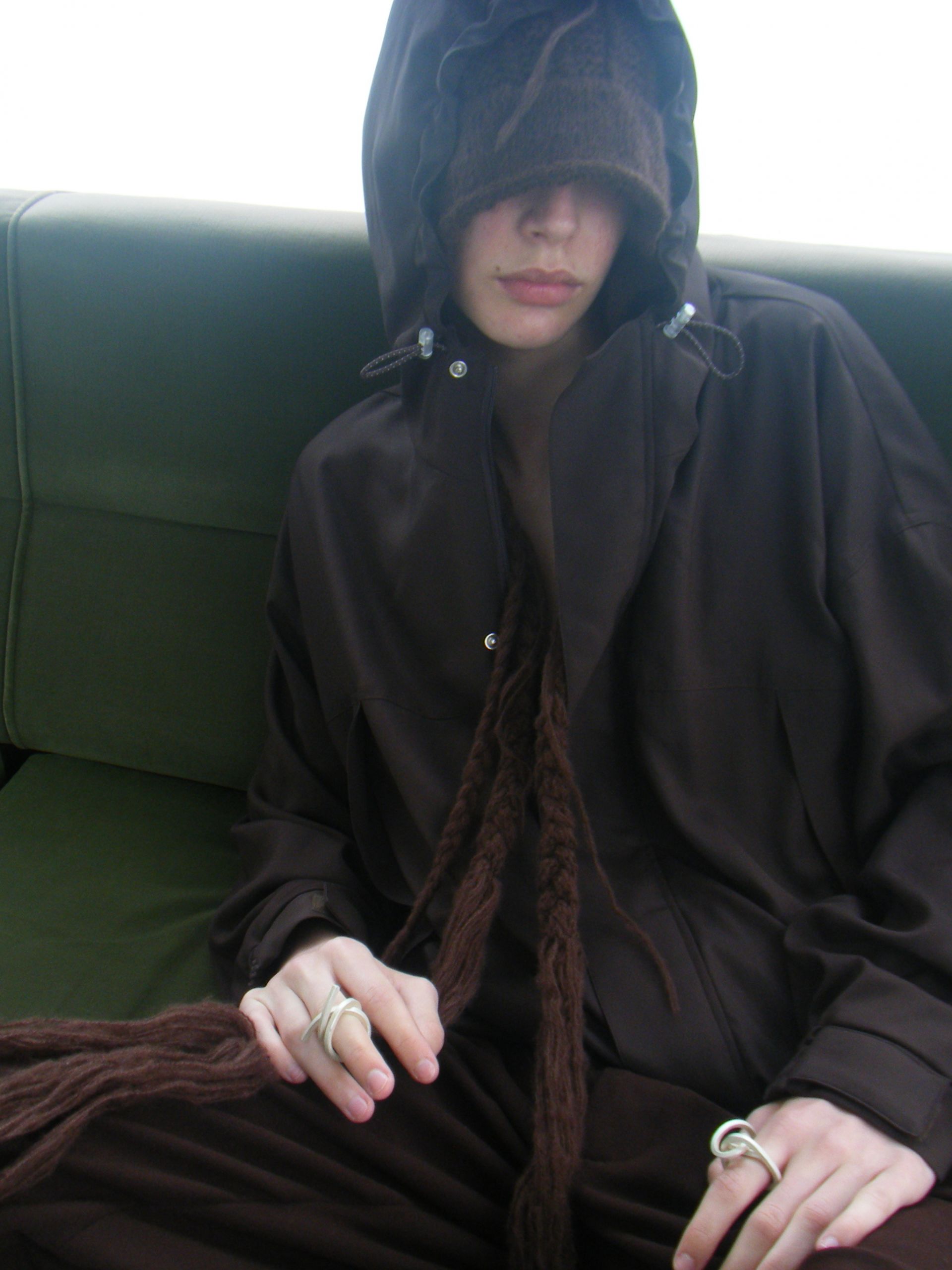 A satin-made jacket designed from a conversation about the ideal outfit for going to a club. Combining outdoor and sporty functionality with an elegant, flowing drape evokes an intriguing contradiction. The blend of indoor/classical and outdoor/functional aesthetics creates a fascinating contrast. It features a soft, thin fleece lining for warmth, making it both stylish and functional.
