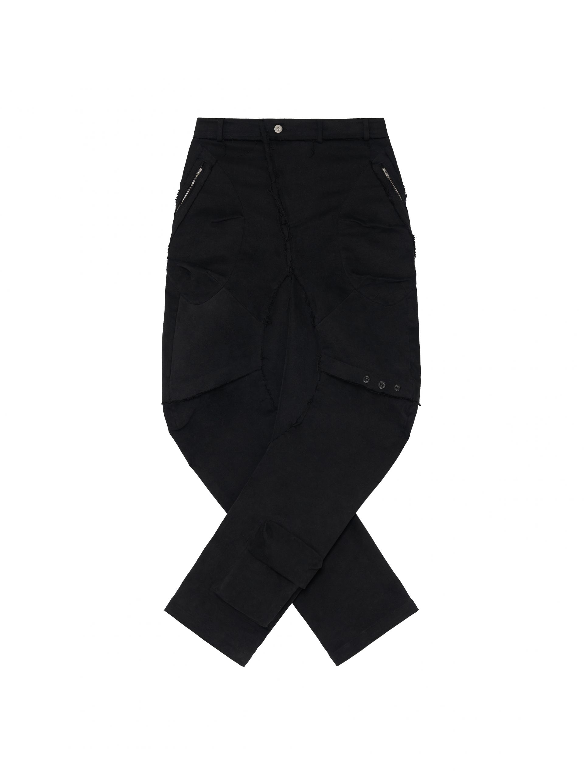 Rough-cut fabric pieces attached beneath the zippers as detailing.