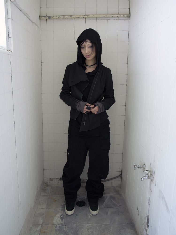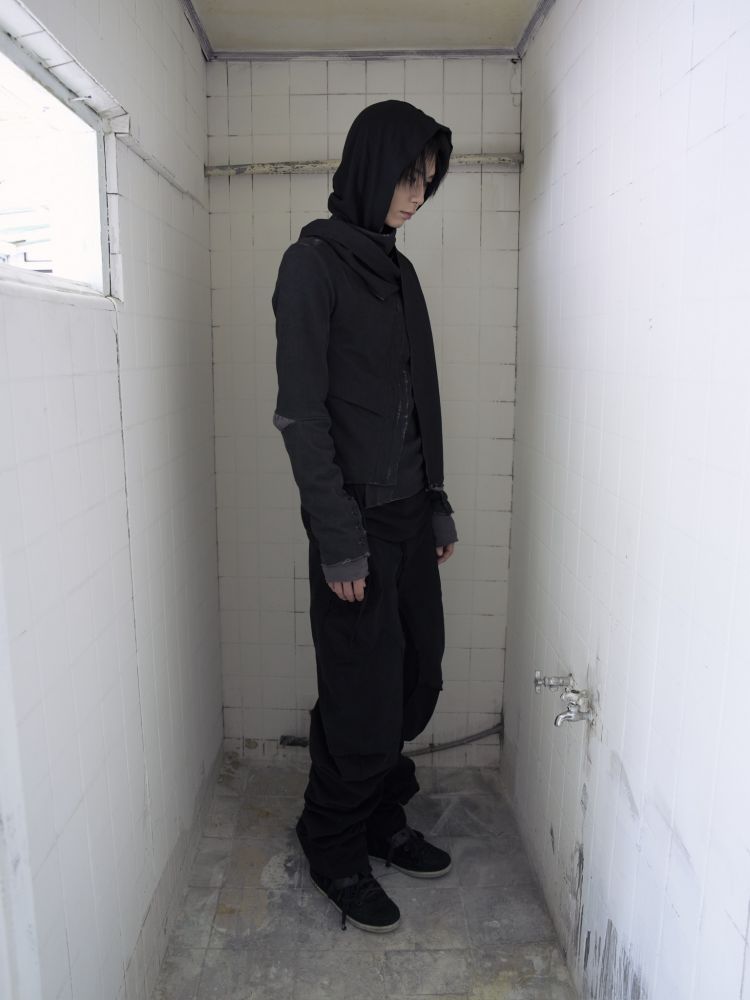 * Raw seams and irregular structures create an overall experimental and sculptural impression.