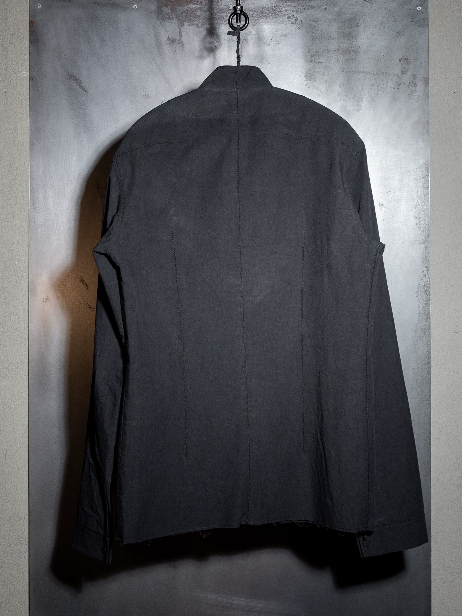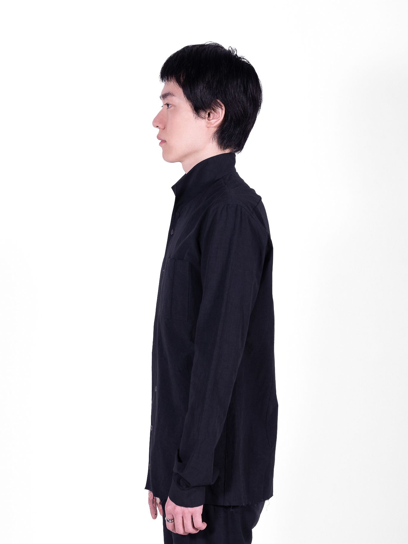 This shirt features a single continuous panel for the collar and front body. Additionally, the two-way collar and scar-stitched detail make it unique.