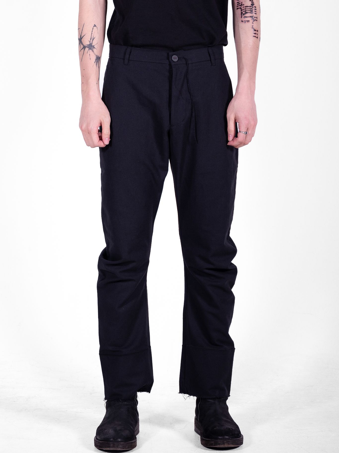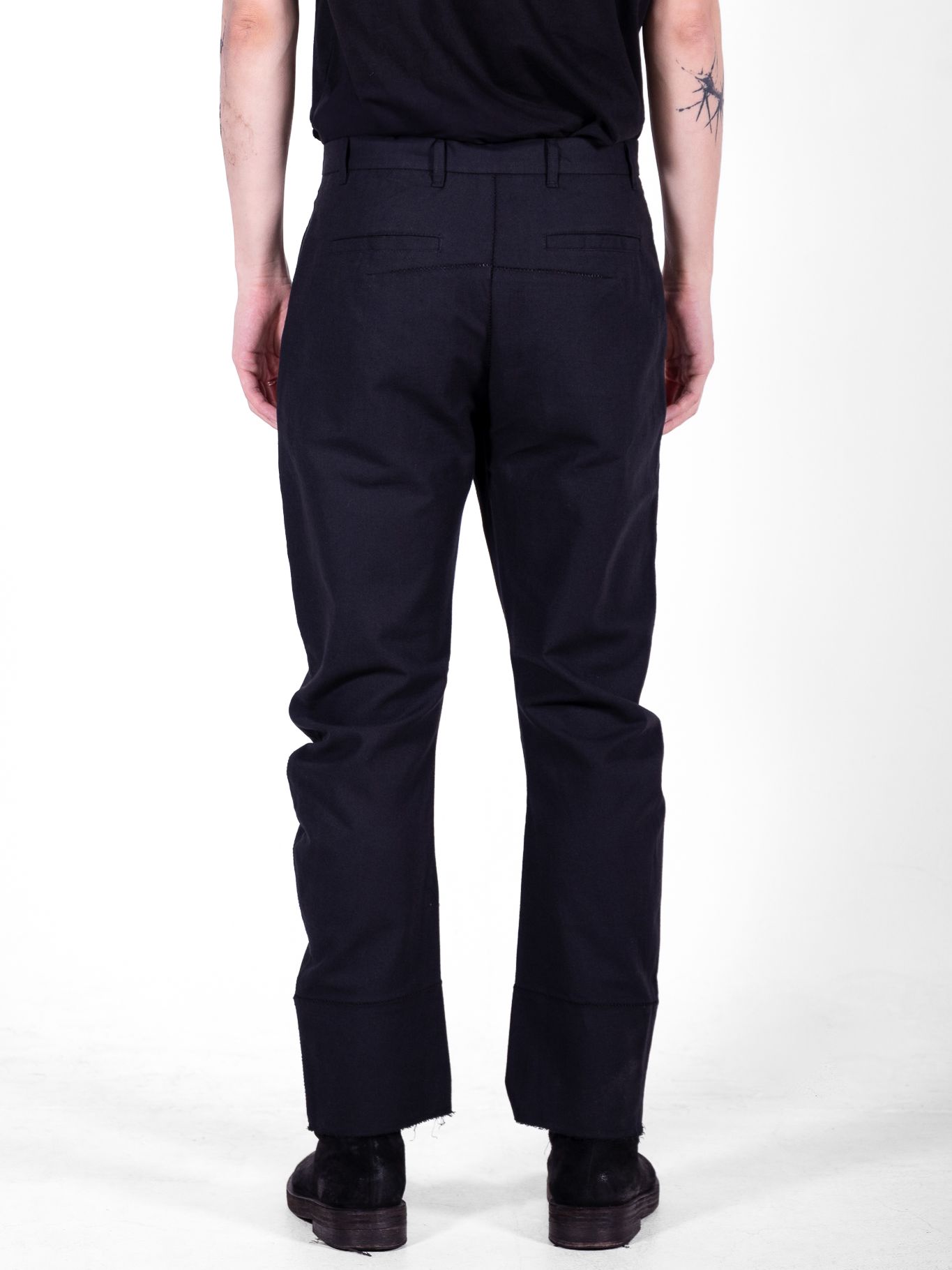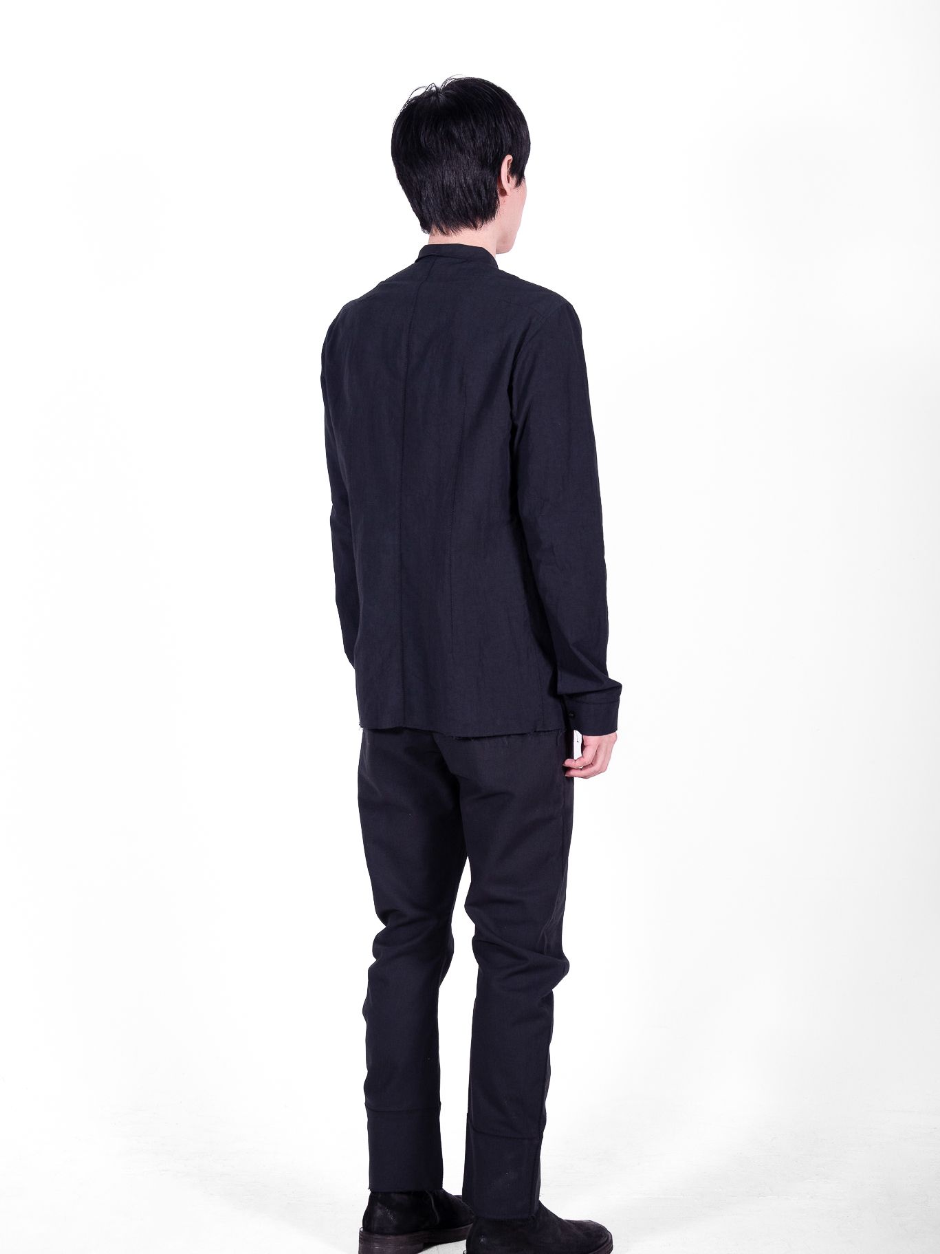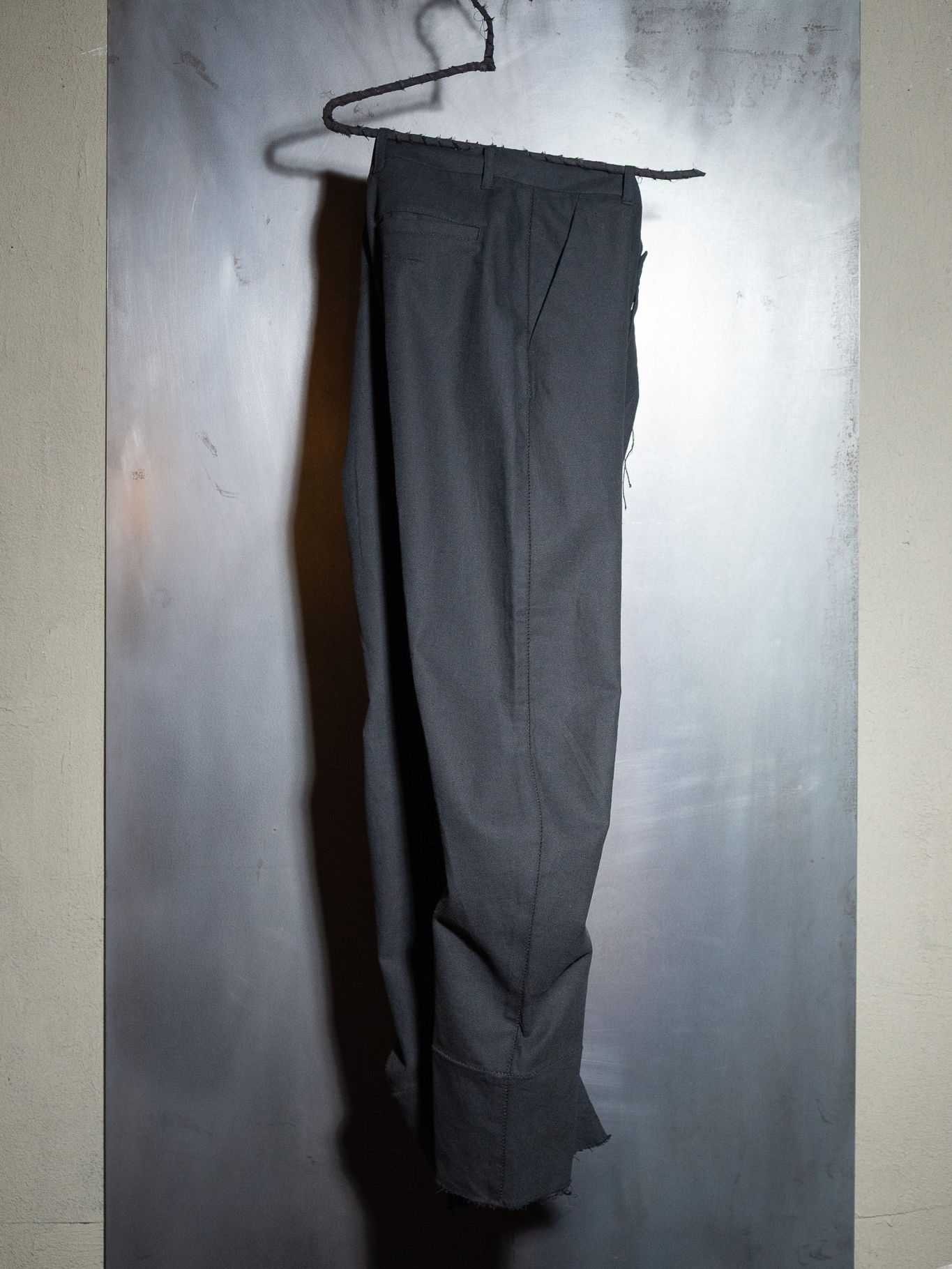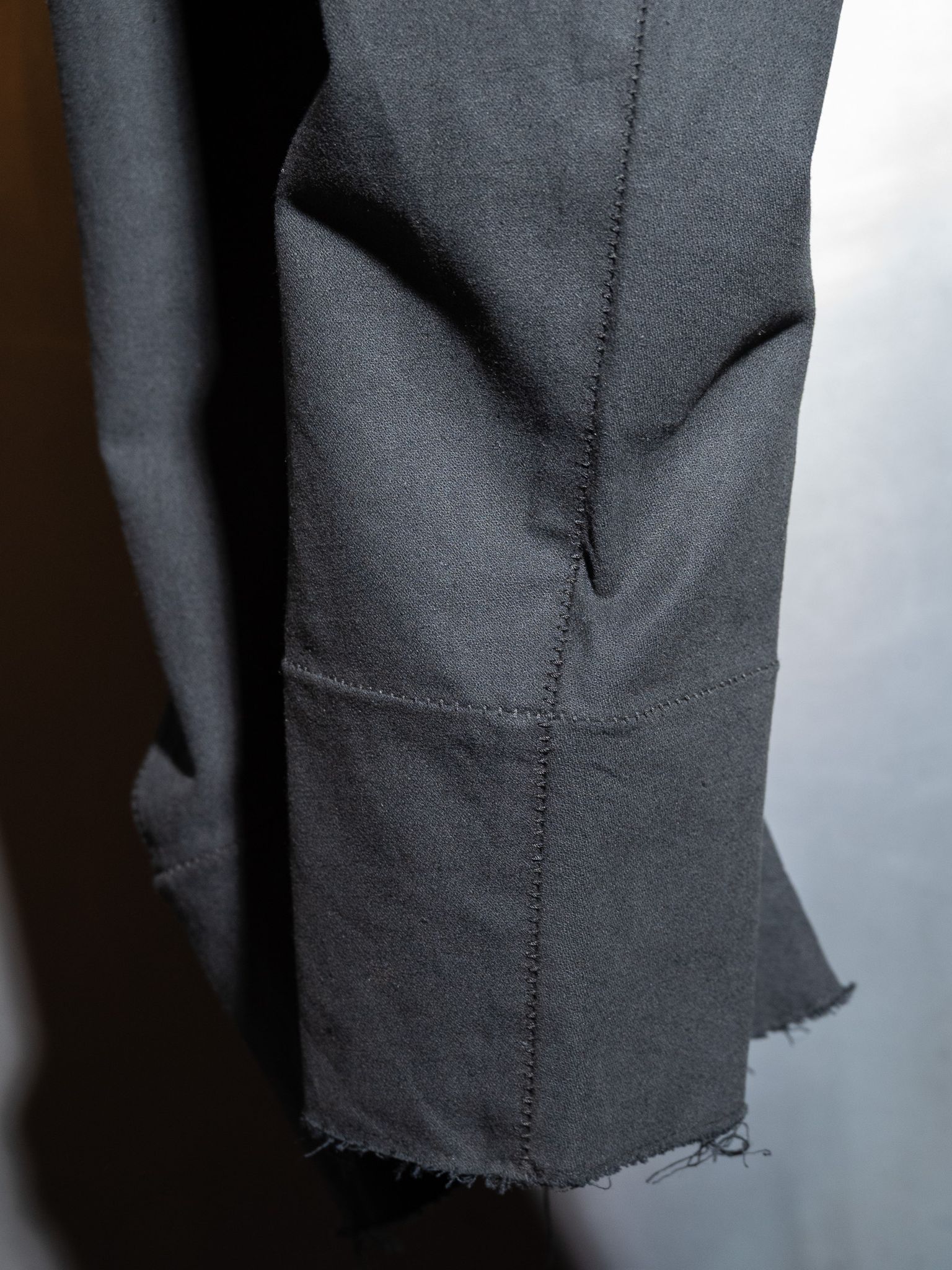 We twisted the conventional way of cutting to create a bizarre silhouette. Intentionally shaped to mismatch the human body, the garment causes collisions—creating irregular wrinkles that are accentuated with scar-stitches.