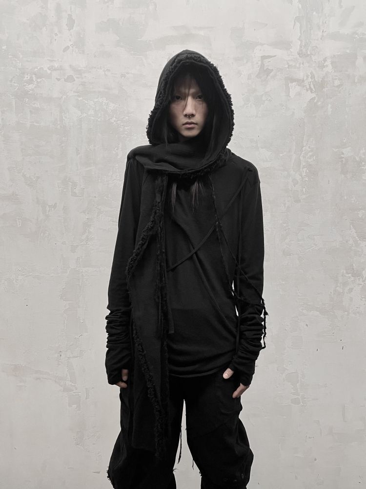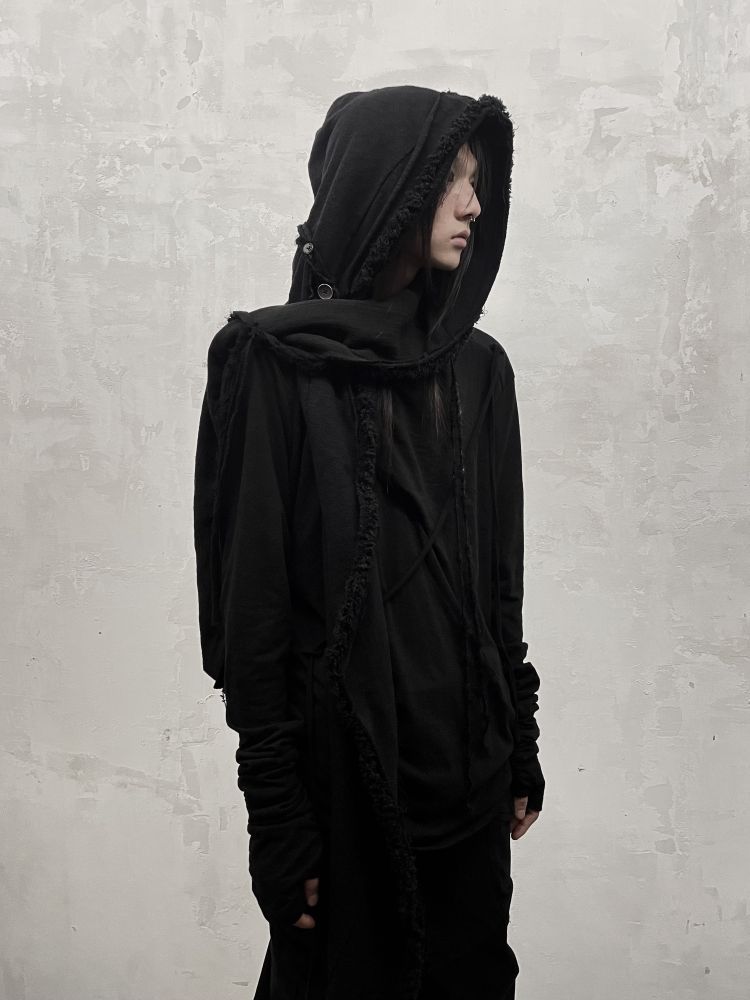 * A double-layered, reversible hooded muffler featuring slub jersey as the outer fabric and a textured cotton lining designed to fray and unravel naturally.