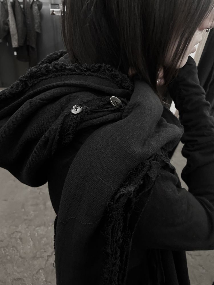 * Hooded muffler based on textured fabrics, highlighted by decorative details such as fringe and silk slub yarn.